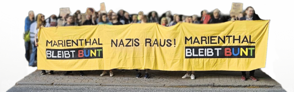 In 2022, the neighborhood alliance “Marienthal bleibt bunt” came together to raise awareness about the establishment of the student fraternity Burschenschaft Germania in the Hamburg district of Marienthal and to advocate for a vibrant, diverse, and supportive neighborhood.